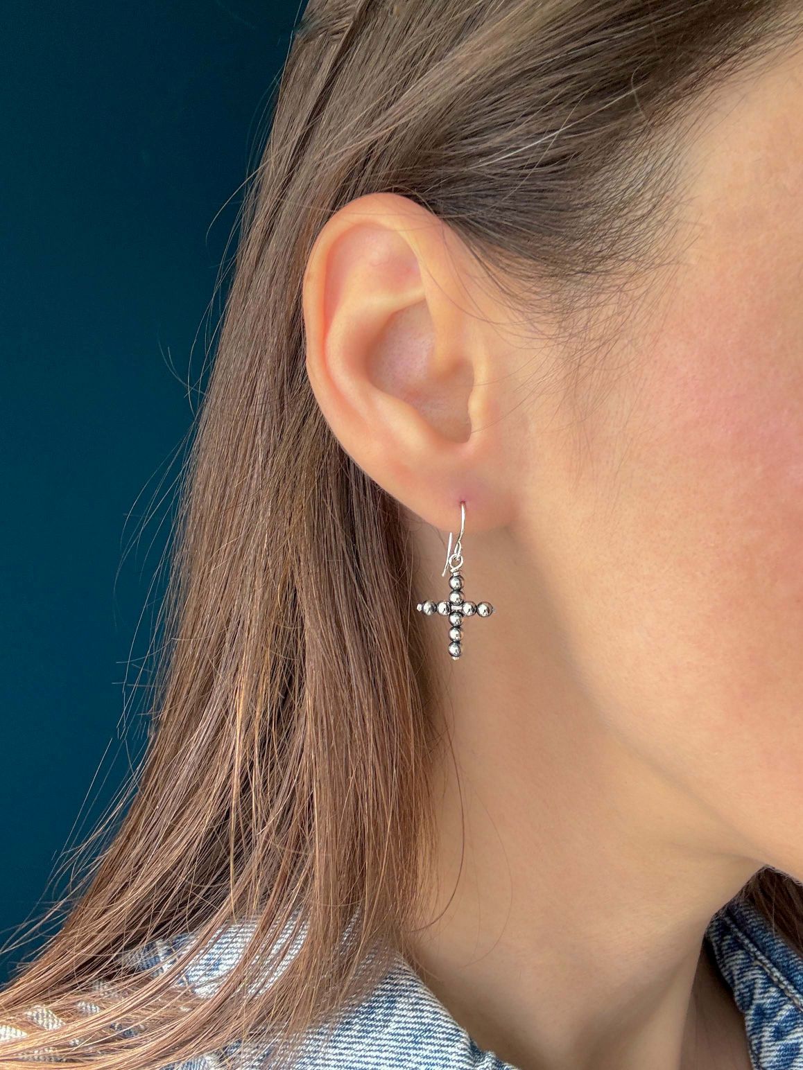 Delicate sterling silver cross earrings featuring hand-forged details and intricate bead work that captures light beautifully. Each pair hangs from handmade fishhook earwires and is secured with silicone backs for all-day comfort.