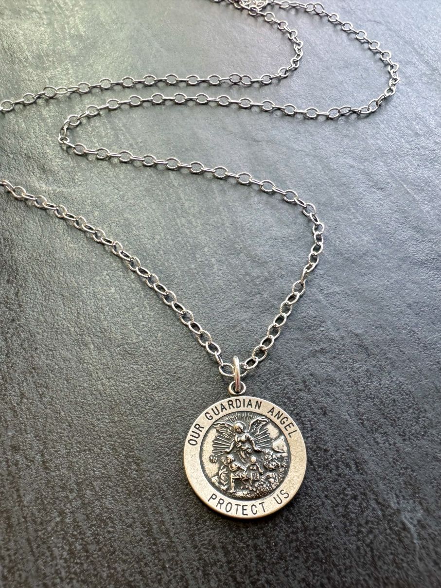 Sterling silver necklace with Guardian Angel Medallion pendant.