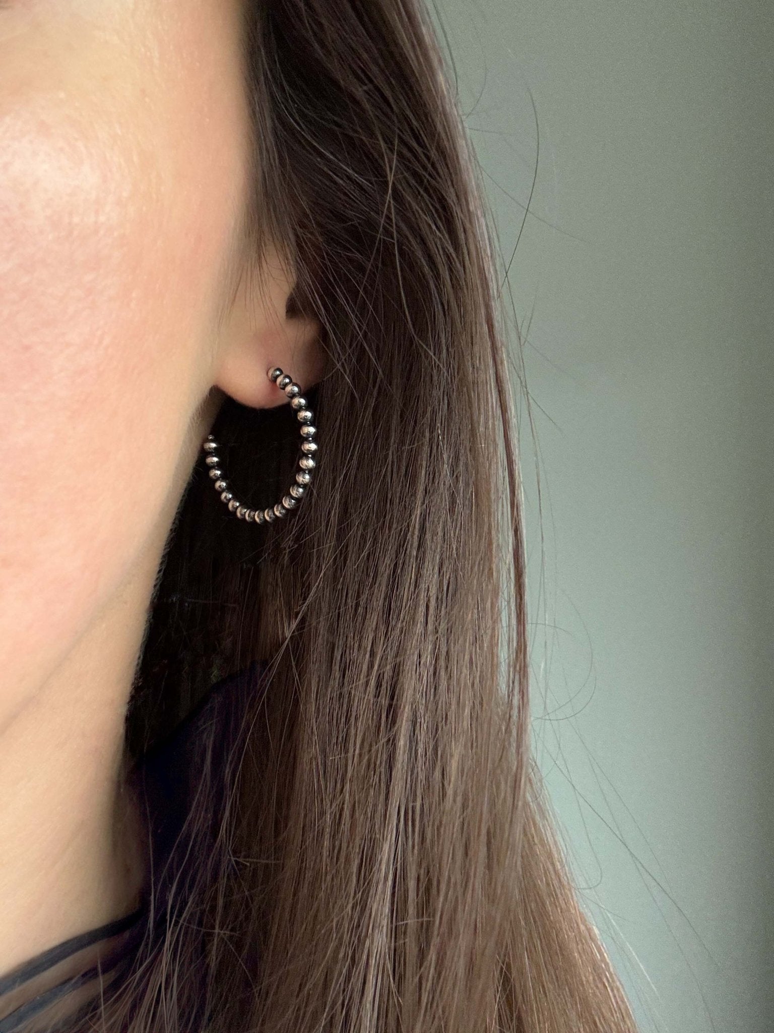 Oxidized sterling silver delicate lightweight beaded hoop earrings. These minimal open hoop earrings are post style wire hoops adorned with tiny sterling beads in a style of a Navajo Pearl.